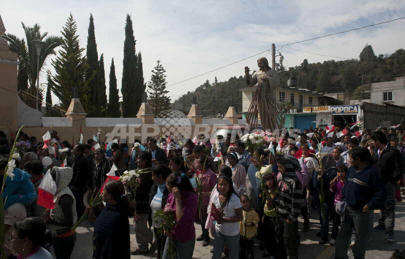 写真は、ポポカテペトル山に近いメキシコ中部プエブラ(Puebla)州Santiago Xalitxintlaで、「Senor de Las Misericordias」の像を行進しながら運ぶ住民ら(2012年4月21日撮影)。(c)AFP/Yuri CORTEZ
