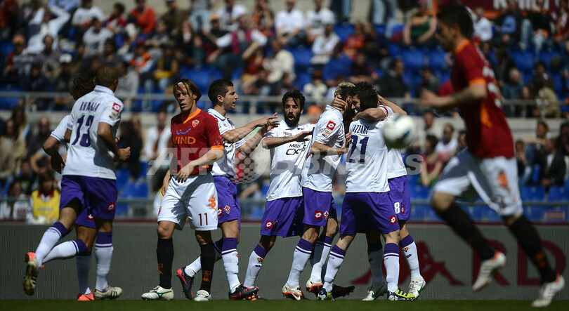 得点を挙げたフィオレンティーナのステヴァン・ヨヴェティッチ(Stevan Jokovic )を祝福する選手(2012年4月25日撮影)。(c)AFP/Filippo MONTEFORTE