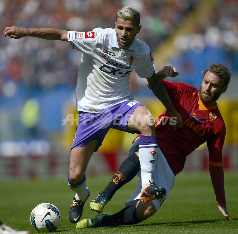 ASローマのダニエレ・デ・ロッシ(Daniele De Rossi、右)とボールを競るフィオレンティーナのヴァロン・ベーラミ(Valon Behrami、2012年4月25日撮影)。(c)AFP/Filippo MONTEFORTE