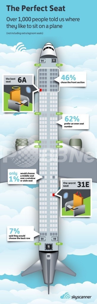 その理由は、機体前方左側の窓側の席だから。窓と窓の間隔の関係で頭を壁にもたれ掛けさせられるのだという。また回答者の45%が前から6列目までの席が好ましいと答えた。