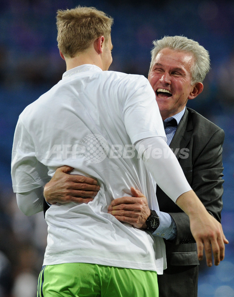 ペナルティーキック(PK)戦の末に決勝進出を決め、GKマヌエル・ノイアー(Manuel Neuer、左)と喜ぶバイエルン・ミュンヘンのユップ・ハインケス監督(Jupp Heynckes、2012年4月25日撮影)。(c)AFP/CHRISTOF STACHE
