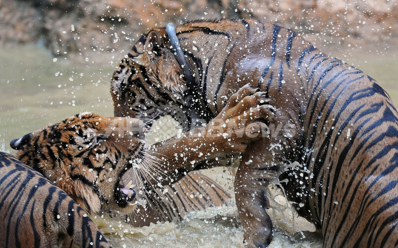 写真は、水遊びをするトラ(2012年4月24日撮影)。(c)AFP/PORNCHAI KITTIWONGSAKUL