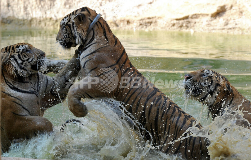 写真は、水遊びをするトラ(2012年4月24日撮影)。(c)AFP/PORNCHAI KITTIWONGSAKUL