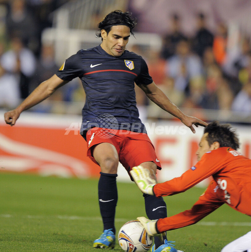 バレンシアのGKジエゴ(Diego Alves Carreira)に得点機を阻まれるアトレティコ・マドリードのラダメル・ファルカオ・ガルシア(Radamel Falcao Garcia、2012年4月26日撮影)。(c)AFP/JOSE JORDAN