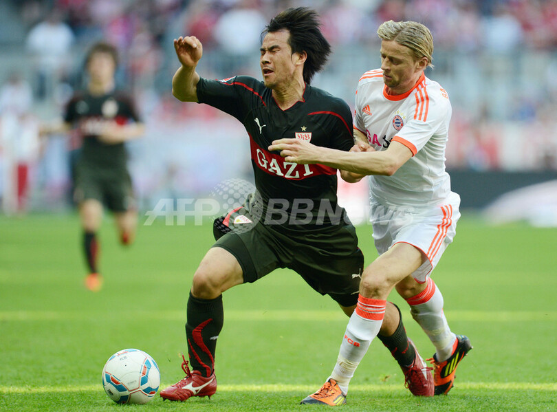 バイエルン・ミュンヘンのアナトリー・ティモシュチュク(Anatoly Tymoshchuk)とボールを競るVfBシュツットガルトの岡崎慎司(Okazaki Shinji、2012年4月28日撮影)。(c)AFP/CHRISTOF STACHE