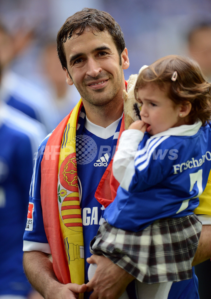 試合後のピッチで娘を抱きかかえるシャルケのラウル・ゴンザレス(Raul Gonzalez、2012年4月28日撮影)。(c)AFP/PATRIK STOLLARZ