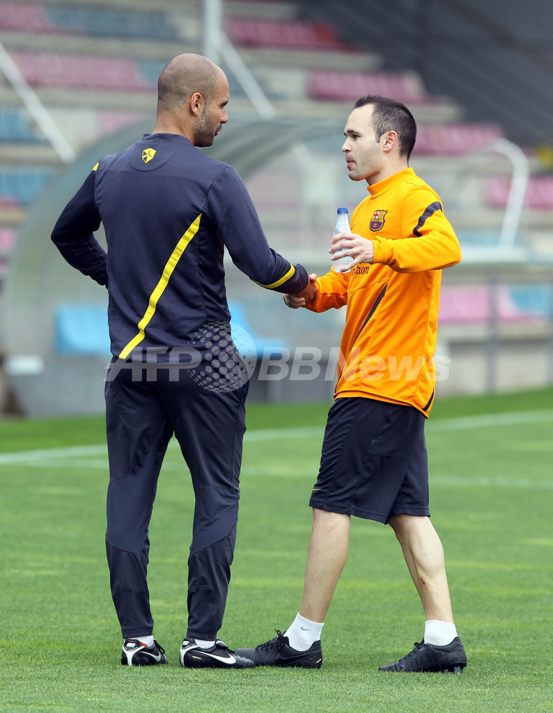 記者会見後に行われた練習でジョゼップ・グアルディオラ監督と握手を交わすFCバルセロナのアンドレス・イニエスタ(Andres Iniesta、2012年4月27日撮影)。(c)AFP/FCBARCELONA/MIGUEL RUIZ