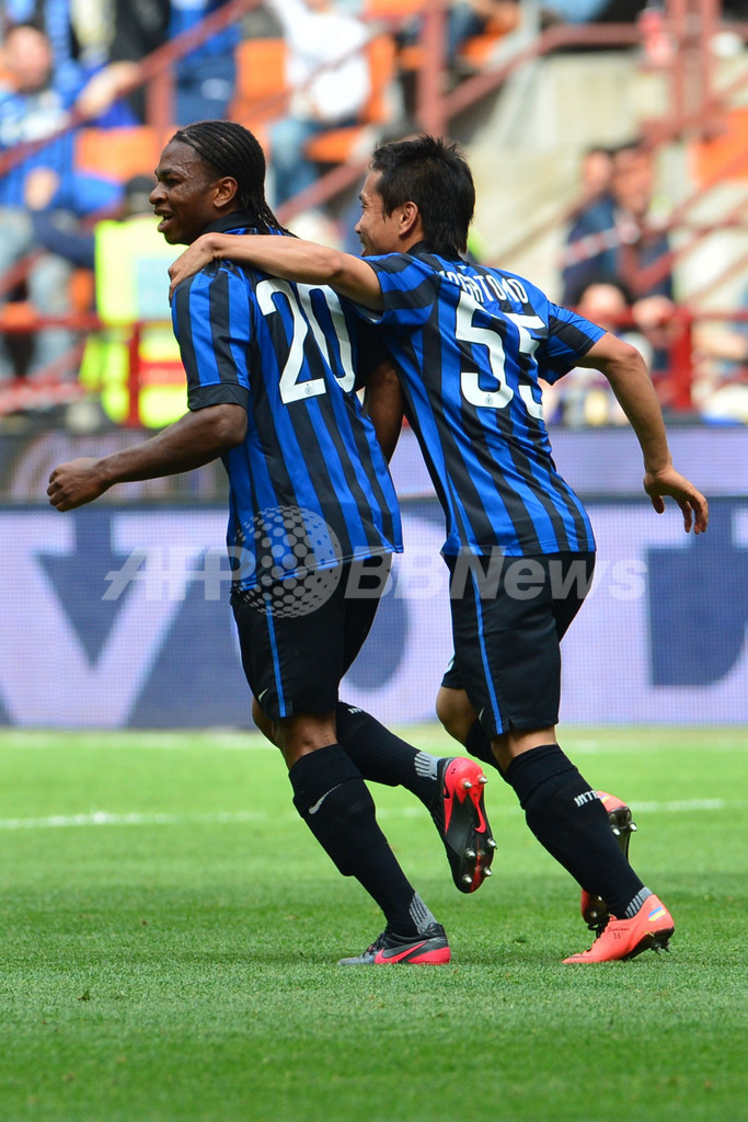 後半14分に同点ゴールを決めて長友佑都(Yuto Nagatomo)に祝福されるインテルのジョエル・オビ(Joel Obi、2012年4月29日撮影)。(c)AFP/GIUSEPPE CACACE