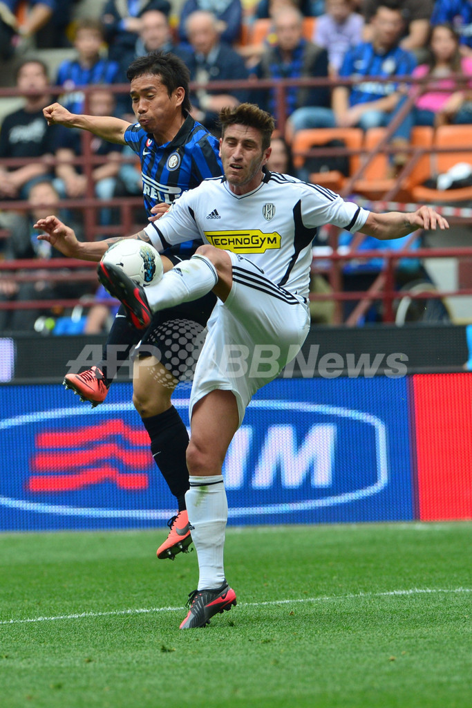 チェゼーナのルカ・チェカレッリ(Luca Ceccarelli)とボールを競るインテルの長友佑都(Yuto Nagatomo、2012年4月29日撮影)。(c)AFP/GIUSEPPE CACACE