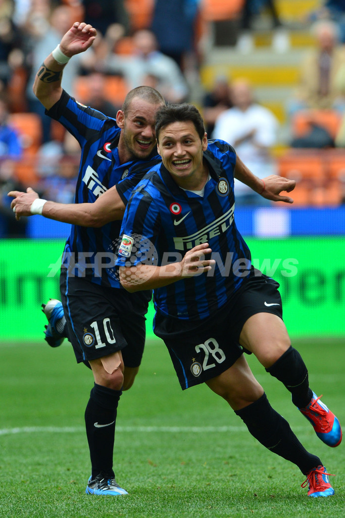 後半27分に決勝点を挙げ、チームメイトのウェズレイ・スナイデル(Wesley Sneijder)に祝福されるインテルのマウロ・サラテ(Mauro Zarate、2012年4月29日撮影)。(c)AFP/GIUSEPPE CACACE