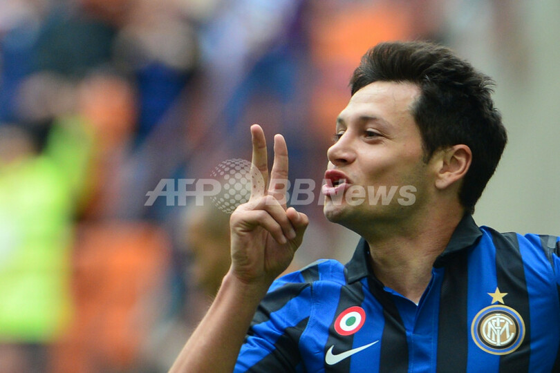 後半27分に決勝点を挙げて歓喜するインテルのマウロ・サラテ(Mauro Zarate、2012年4月29日撮影)。(c)AFP/GIUSEPPE CACACE