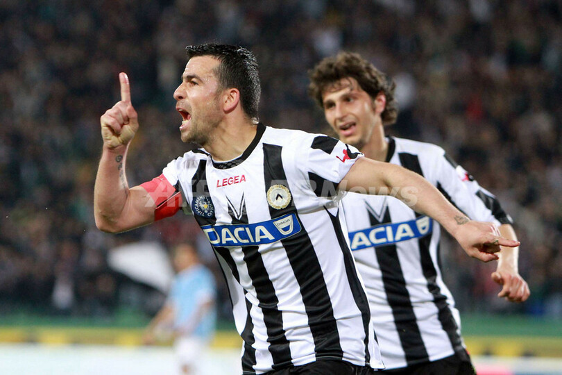 後半24分に先制点を挙げて歓喜するウディネーゼのアントニオ・ディ・ナターレ(Antonio Di Natale、2012年4月29日撮影)。(c)AFP/SIMONE FERRARO