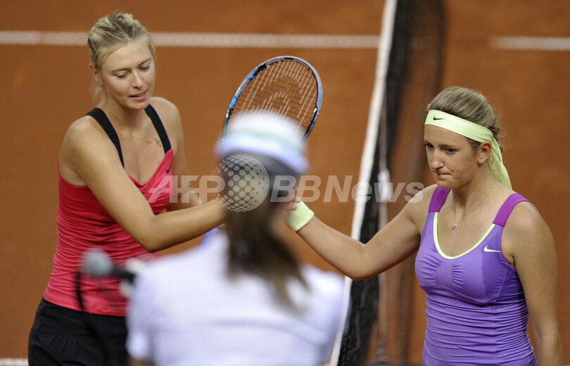 試合後に握手を交わすビクトリア・アザレンカとマリア・シャラポワ(2012年4月29日撮影)。(c)AFP/THOMAS KIENZLE