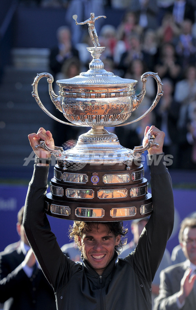 優勝を飾り、トロフィーを掲げるラファエル・ナダル(Rafael Nadal、2012年4月29日撮影)。(c)AFP/JOSEP LAGO