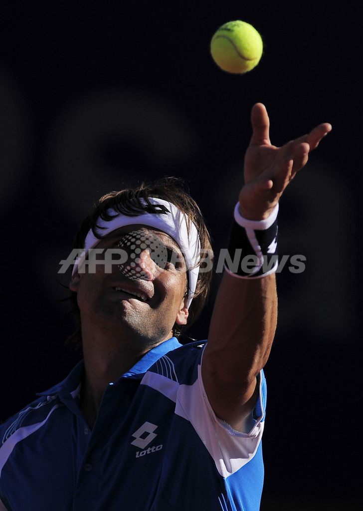 サーブトスを上げるダビド・フェレール(2012年4月29日撮影)。(c)AFP/JOSEP LAGO