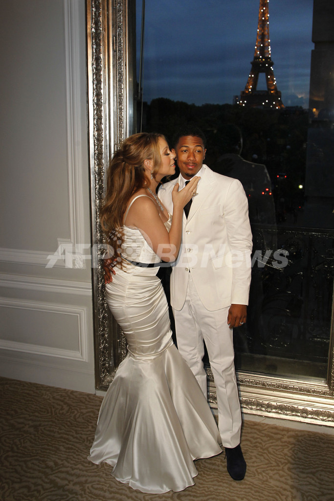 米歌手マライア・キャリー(Maria Carey)と夫のニック・キャノン(Nick Cannon)が4月27日、結婚4周年を祝うためパリ(Paris)のエッフェル塔(Eiffel Tower)を訪れた。写真は、エッフェル塔前で記念撮影を行うマライアとニック(2012年4月27日撮影)。(c)AFP/THOMAS SAMSON