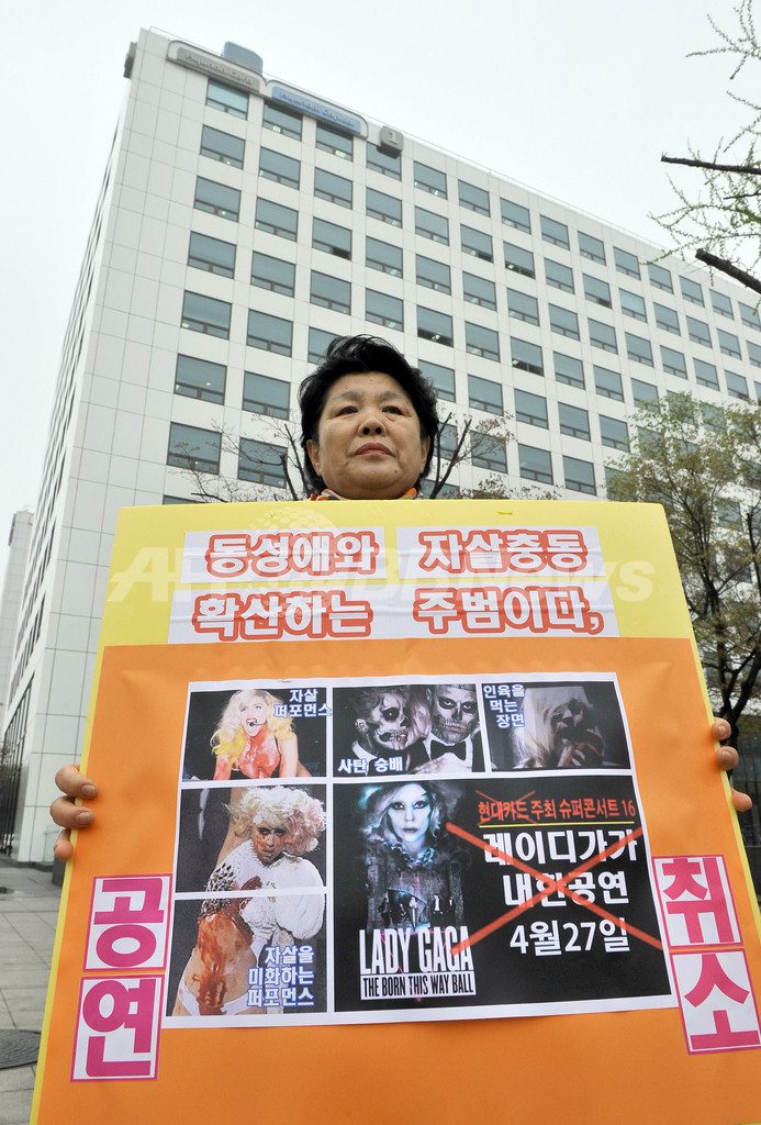 写真は、コンサートを主催した現代カード(Hyundai Card)の本社前で、コンサートへの抗議活動を行うキリスト教団体の女性(2012年4月23日撮影)。(c)AFP/JUNG YEON-JE