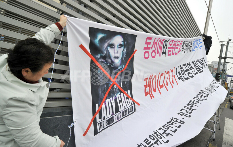 レディー・ガガの韓国公演、会場にはファンの他に反対派も