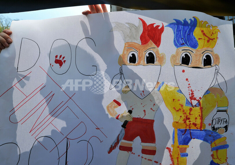 【4月30日 AFP】ウクライナの首都キエフ(Kiev)で28日、6月にポーランドと共催するサッカー欧州選手権2012(UEFA Euro 2012)の開幕を控えて当局が「美化運動」と称して行っている野良犬の殺処分に対し、動物愛護活動家らが抗議デモを行った。(c)AFP