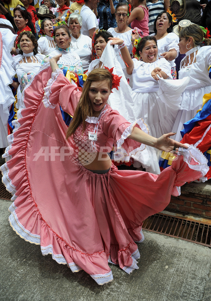 インターナショナル・ダンス・デー(International Dance Day)の29日、南米コロンビアの首都ボゴタ(Bogota)で、集団で踊る人数のギネス世界記録(Guinness World Record)への挑戦が行われた。ダンスに使われた「赤いスカートのクンビア(La Pollera Colora)」は、第2の国歌といわれるほどコロンビアでは代表的な曲だ(2012年4月29日撮影)。(c)AFP/GUILLERMO LEGARIA