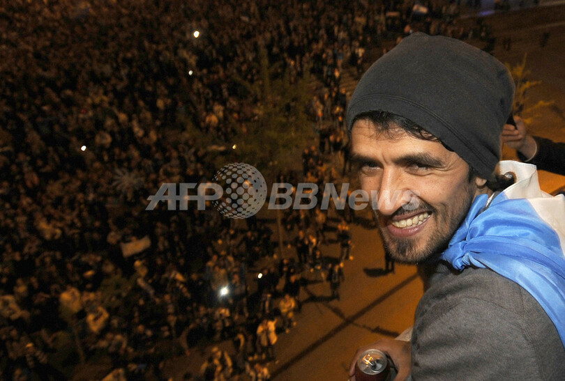 本拠地ドラゴン・スタジアム(Dragao Stadium)の前に集まったサポーターと優勝決定を喜ぶFCポルトのルイス・ゴンサレス(Luis Gonzalez、2012年4月29日撮影)。(c)AFP/FERNANDO VELUDO