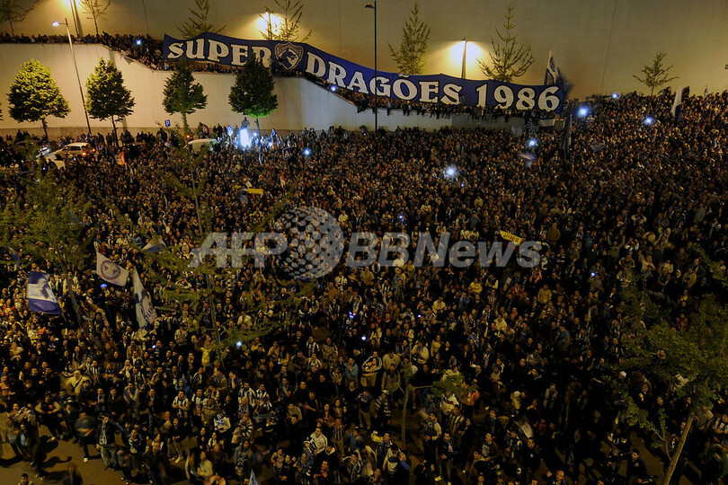 優勝決定を受け、本拠地ドラゴン・スタジアム(Dragao Stadium)の前に集まったFCポルトのサポーター(2012年4月28日撮影)。(c)AFP/FERNANDO VELUDO