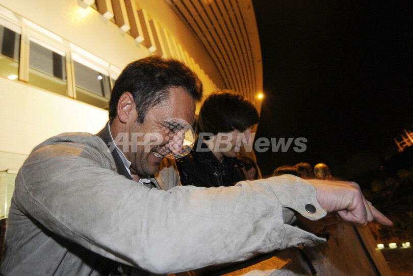 本拠地ドラゴン・スタジアム(Dragao Stadium)の前に集まったサポーターと優勝決定を喜ぶFCポルトのヴィトール・ペレイラ監督(Vitor Pereira、2012年4月29日撮影)。(c)AFP/FERNANDO VELUDO