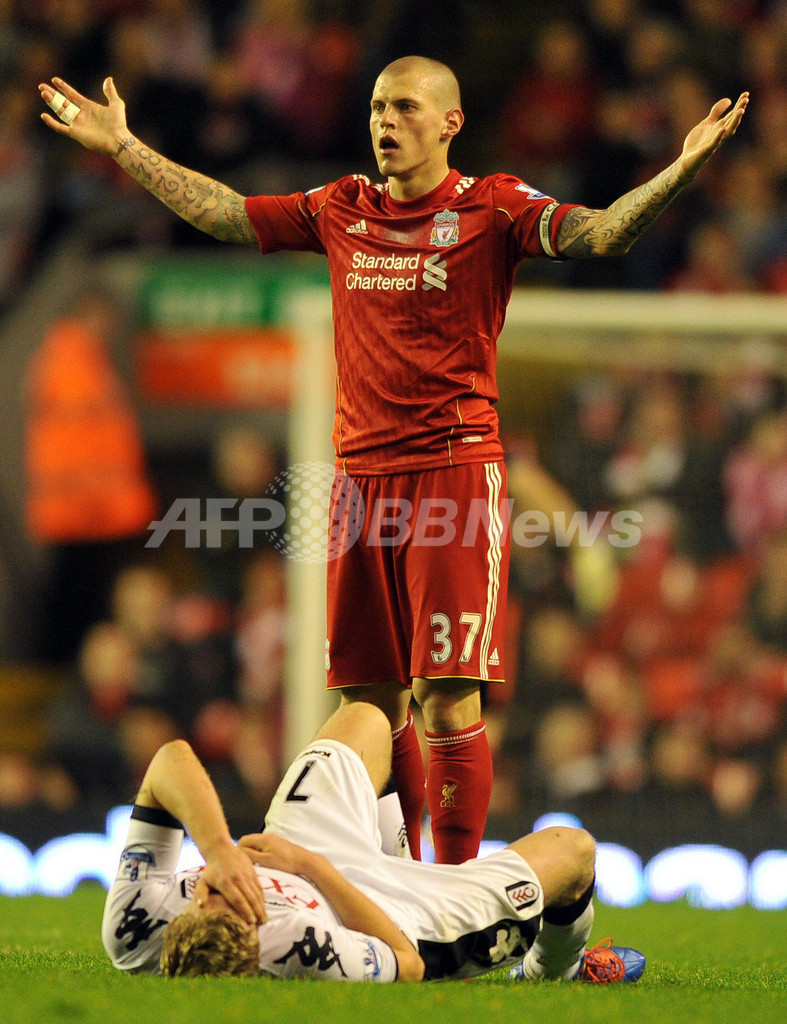 フラムのパベル・ポグレブニャク(Pavel Pogrebnyak、下)へのタックルの後に、主審にアピールするリバプールのマルティン・シュクルテル(Martin Skrtel、2012年5月1日撮影)。(c)AFP/PAUL ELLIS