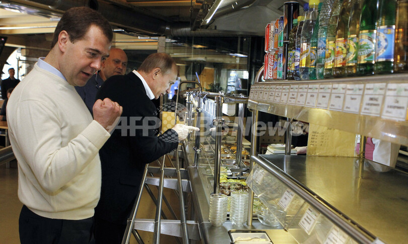 ビールの注文を終えた2人はセルフサービスのフードカウンターへ向かい、プーチン首相はゆでたジャガイモとタラを、メドベージェフ大統領はフライドポテトとラムソーセージを手に取った。