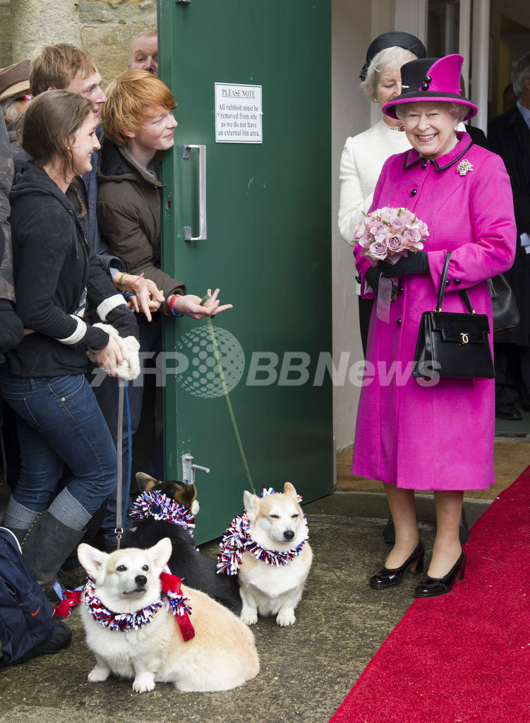 写真はコーギー犬を連れた市民の歓迎を受けるエリザベス女王(右、2012年5月1日撮影)。(c)AFP/ARTHUR EDWARDS