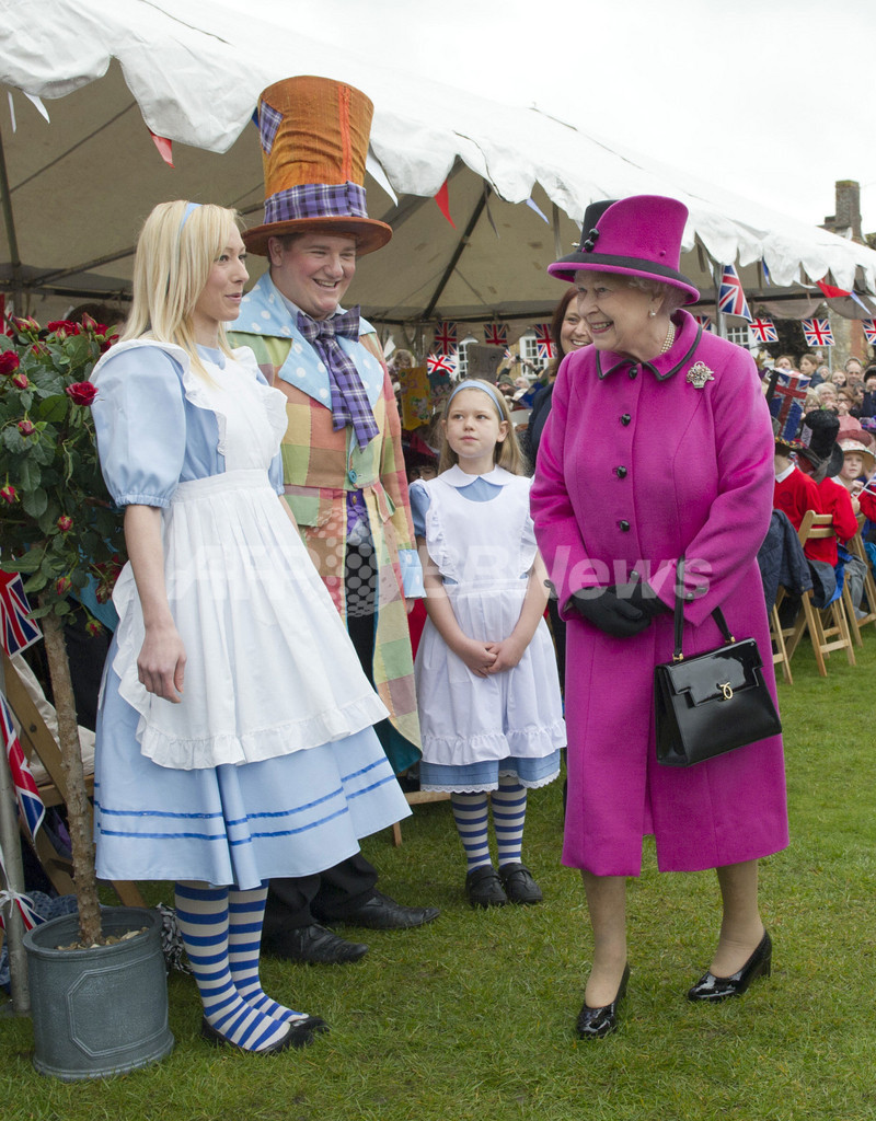 写真は英小説「不思議の国のアリス(Alice in Wonderland)」のキャラクターに扮(ふん)した人々と交流するエリザベス女王(右、2012年5月1日撮影)。(c)AFP/ARTHUR EDWARDS