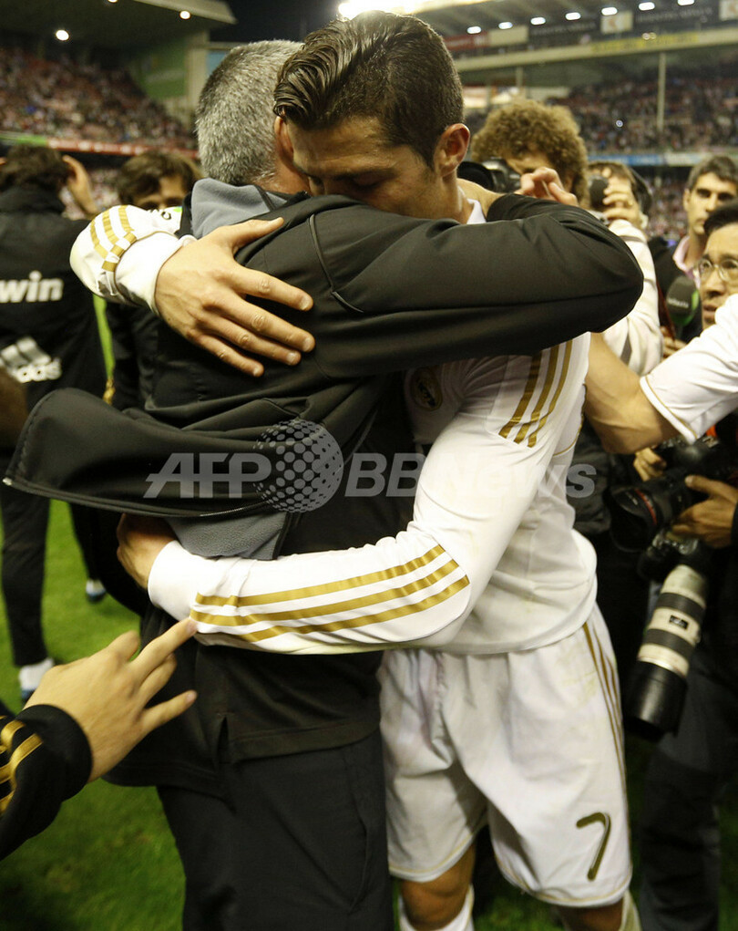 リーグ優勝を果たし、抱き合うレアル・マドリードのジョゼ・モウリーニョ監督(Jose Mourinho、左)とクリスティアーノ・ロナウド(Cristiano Ronaldo2012年5月2日撮影)。(c)AFP/CESAR MANSO