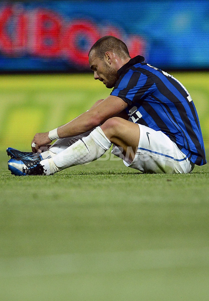 敗戦を喫し、落胆してピッチに座り込むインテルのウェズレイ・スナイデル(Wesley Sneijder、2012年5月2日撮影)。(c)AFP/Filippo MONTEFORTE