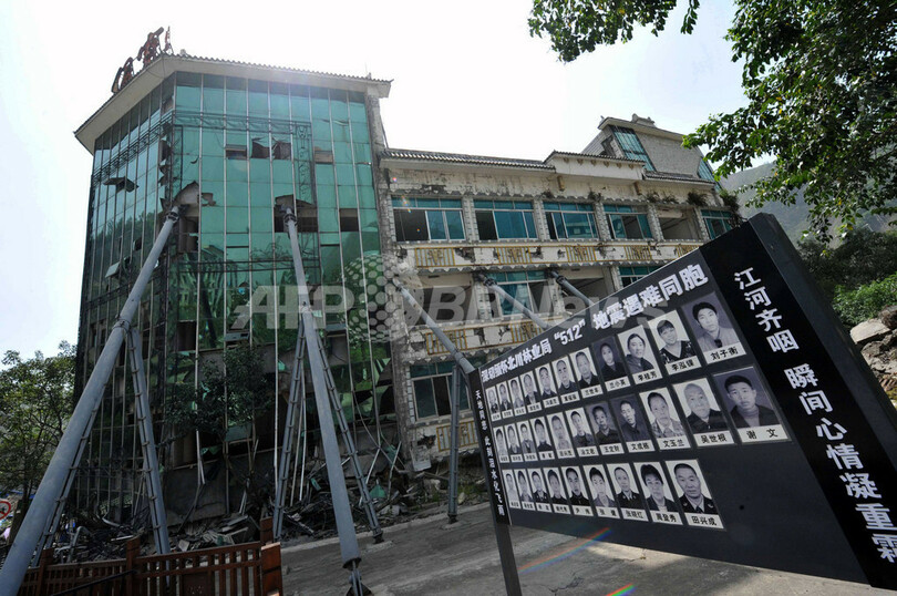 写真は中国・四川省北川(Beichuan)県で、震災メモリアルとして保存されている地震で損壊した建物と、この場所で亡くなった人たちの写真(2012年4月30日撮影)。(c)AFP