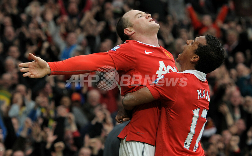 後半32分に得点を挙げ、チームメイトのナニ(%%Luis Cunha aka Nani%%)とともに歓喜するマンチェスター・ユナイテッドのウェイン・ルーニー(2011年2月12日撮影)。(c)AFP/ANDREW YATES