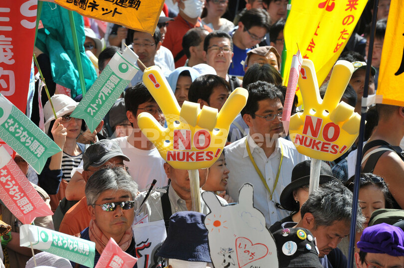 写真は、都内の公園に集結し脱原発を訴える人々(2012年5月5日撮影)。(c)AFP/KAZUHIRO NOGI