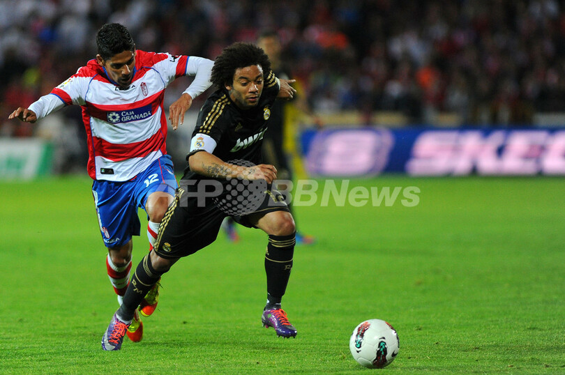 グラナダのフランコ・ハラ(Franco Daniel Jara)とボールを競るレアル・マドリードのマルセロ(Marcelo Vieira Da Silva Junior、2012年5月5日撮影)。(c)AFP/JORGE GUERRERO