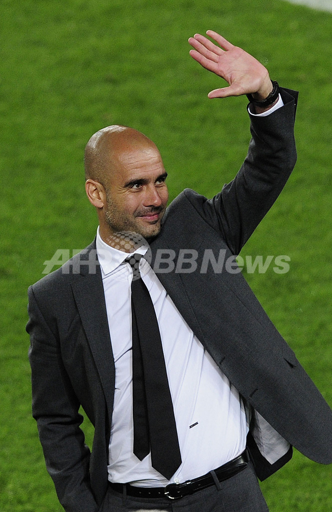 試合後に観衆の声援に応えるFCバルセロナのジョゼップ・グアルディオラ(Josep Guardiola)監督(2012年5月5日撮影)。(c)AFP/LLUIS GENE