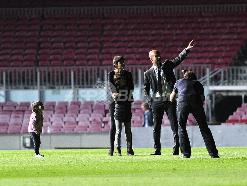 試合後、家族とともに誰もいなくなったカンプ・ノウ・スタジアム(Camp Nou stadium)のピッチに立つFCバルセロナのジョゼップ・グアルディオラ(Josep Guardiola)監督(2012年5月5日撮影)。(c)AFP/JOSEP LAGO
