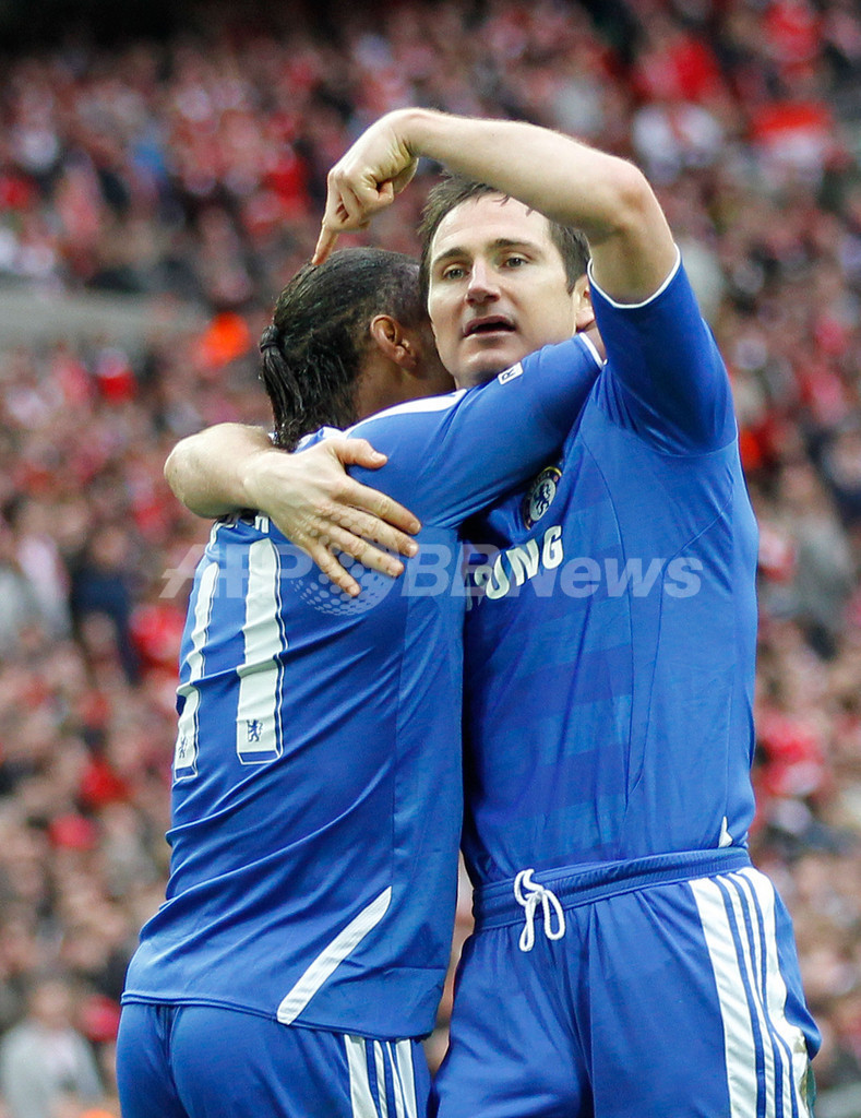 後半7分に追加点を挙げ、ディディエ・ドログバ(Didier Drogba、左)と喜ぶチェルシーのフランク・ランパード(Frank Lampard、2012年5月5日撮影)。(c)AFP/IAN KINGTON