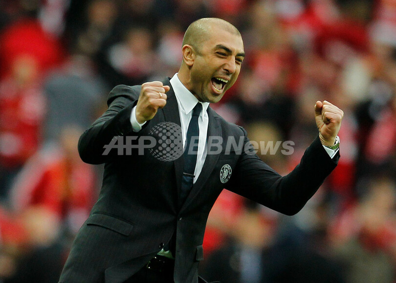 優勝を決めガッツポーズを見せるチェルシーのロベルト・ディ・マッテオ暫定監督(Roberto Di Matteo、2012年5月5日撮影)。(c)AFP/IAN KINGTON