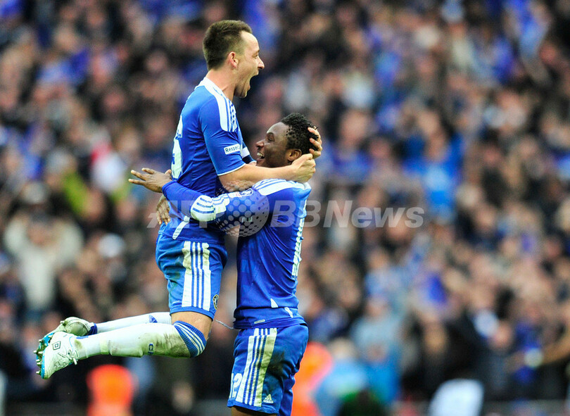 優勝を決め歓喜するチェルシーのジョン・オビ・ミケル(John Obi Mikel、右)とジョン・テリー(John Terry、2012年5月5日撮影)。(c)AFP/GLYN KIRK