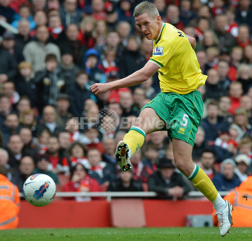 後半40分に同点ゴールを決めるノリッジ・シティのスティーブ・モリソン(Steve Morison、2012年5月5日撮影)。(c)AFP/BEN STANSALL