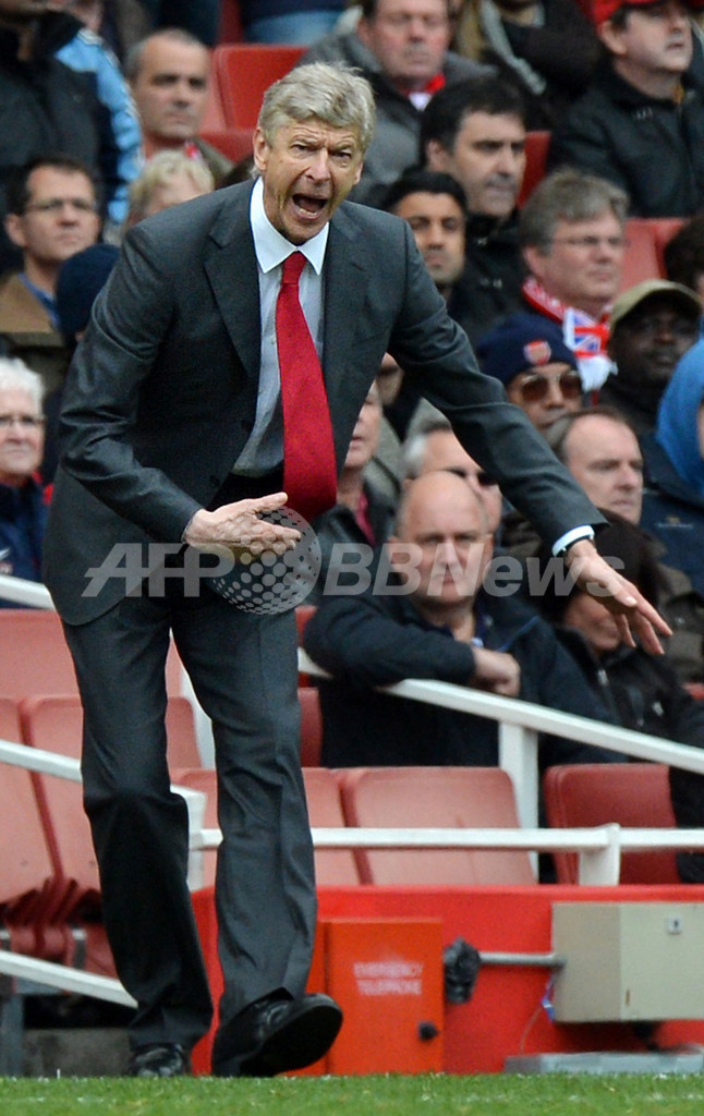 指示を出すアーセナルのアーセン・ベンゲル監督(Arsene Wenger、2012年5月5日撮影)。(c)AFP/BEN STANSALL