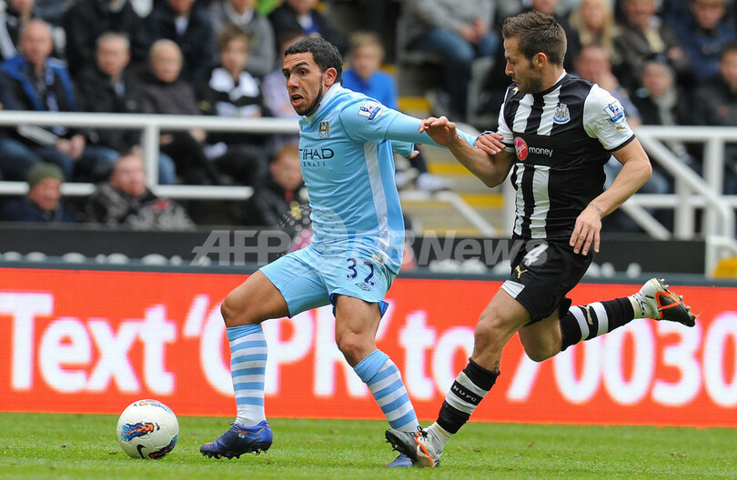 ニューカッスルのヨハン・カバイェ(Yohan Cabaye、右)のチェックを受けるマンチェスター・シティのカルロス・テベス(Carlos Tevez、2012年5月6日撮影)。(c)AFP/ANDREW YATES