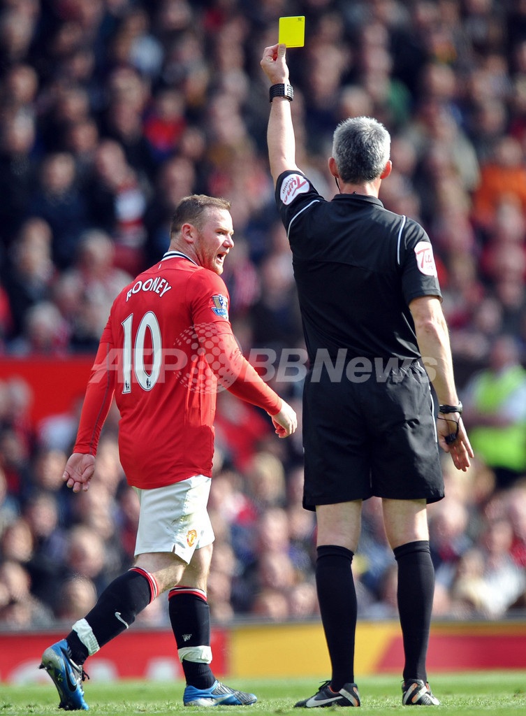 主審からイエローカードを受けるマンチェスター・ユナイテッドのウェイン・ルーニー(Wayne Rooney、2012年5月6日撮影)。(c)AFP/PAUL ELLIS
