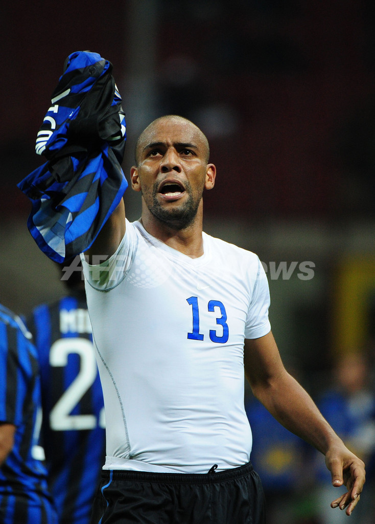 後半42分にチーム4得点目を挙げて観衆の声援に応えるインテルのダグラス・マイコン(Douglas Maicon、2012年5月6日撮影)。(c)AFP/GIUSEPPE CACACE