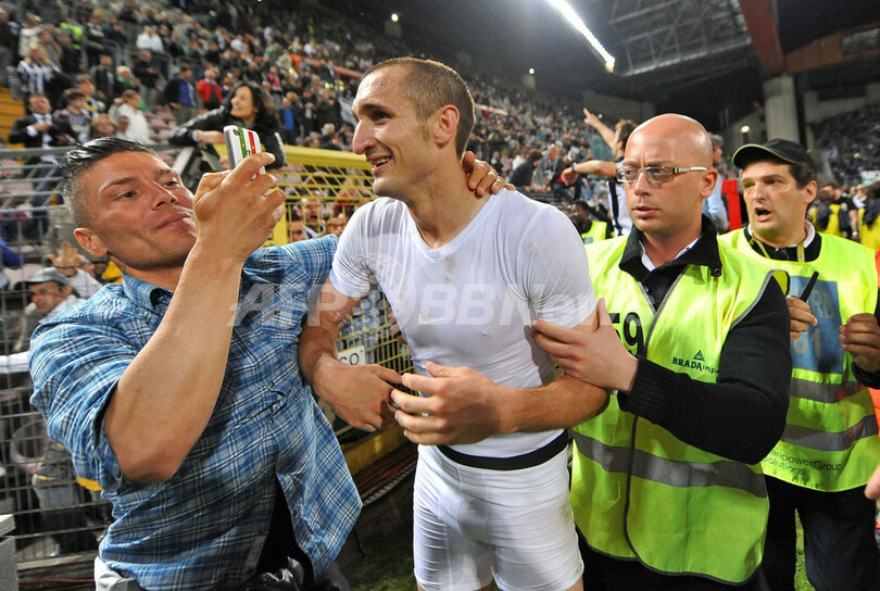 試合後にサポーターから祝福を受けるユベントスのジョルジョ・キエッリーニ(Giorgio Chiellini、2012年5月6日撮影)。(c)AFP/SIMONE FERRARO
