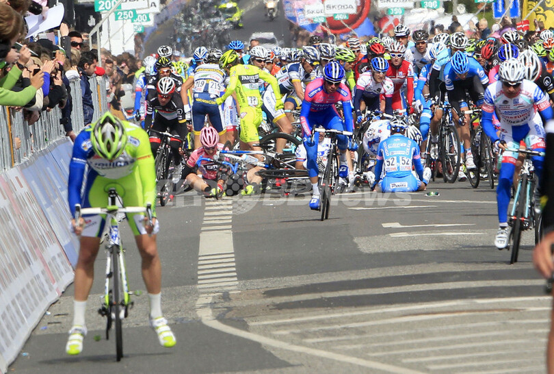 ゴール手前約150メートルの地点でカヴェンディッシュは、アンドローニジョカットリ(Androni Giocattoli)のロベルト・フェラーリ(Roberto Ferrari、イタリア)の右への大きな進路変更により落車、総合首位(マリア・ローザ)に立つBMCレーシングチーム(BMC Racing Team)のテイラー・フィニー(Taylor Phinney、米国)もこのクラッシュに巻き込まれた。