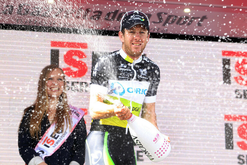ステージを制し、表彰台で歓喜するオリカ・グリーンエッジ・サイクリングチームのマシューハーレー・ゴス(2012年5月7日撮影)。(c)AFP/LUK BENIES